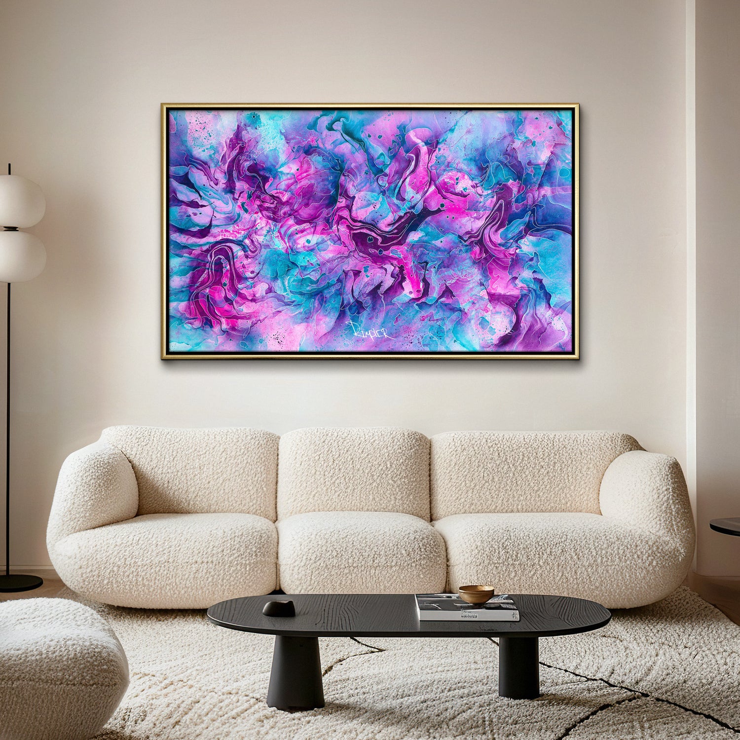 I dette værk åbner Victor Rimpler et sanseligt og drømmelignende rum, hvor farverne synes at bevæge sig frit mellem det flydende og det eksplosive. Nuancer af turkis, violet, magenta og lysende rosa smelter sammen i et vibrerende univers, hvor formen aldrig står stille, men hele tiden opløses og genopstår.