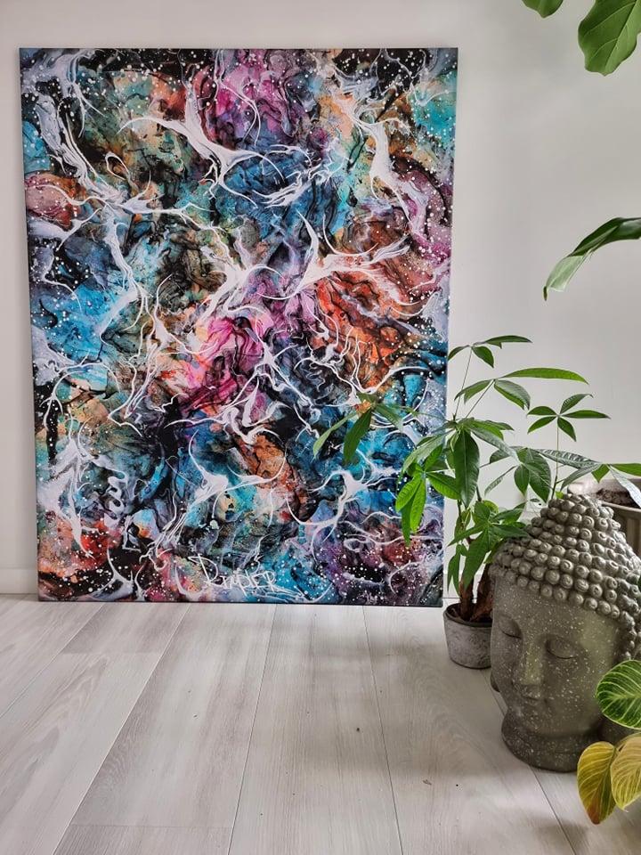Vælg mellem to forskellige størrelser, nemlig 84×110 cm og 100×130 cm, og bestil kunstværket med eller uden sort egetræsramme.
